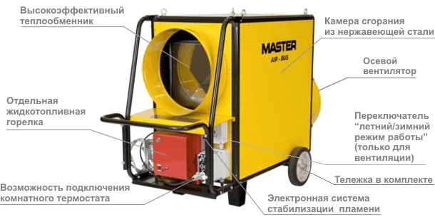 Холодный воздух, при помощи вентилятора, поступает в корпус тепловой пушки и нагревается, проходя через закрытую камеру сгорания. На выходе мы получаем чистый горячий воздух. Продукты сгорания выводятся через дымовую трубу. Дополнительно можно приобрести: комнатный термостат TH 5 (для контролирования температуры в помещении), шланги для подачи топлива, гибки шланги воздуховоды для равномерного распределения тепла, гибкий шланг воздуховод для отвода отработанных газов, топливный бак, воздухораспределительную камеру и топливный щуп.
